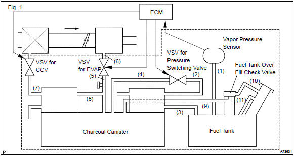 Dtcs p0441 and p0446 are recorded by the ecm when evaporative emissions leak from the components within the dotted line in fig. 1 Below, or when there is malfunction in both vsv for evap and vsv for pressure switching valve, or in the vapor pressure sensor itself.