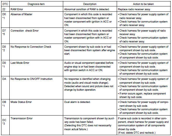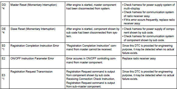 *5: When 210 sec. Has passed after pulling out the power supply connector of the master component with the ignition switch in acc or on, this code is stored.