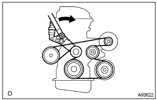 - Turn the v–ribbed belt tensioner slowly clockwise and loosen it. Then, remove the fan and generator v belt and put back the v–ribbed belt tensioner little by little and fix it quietly.