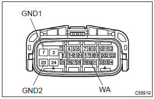 - using service wire, connect terminals wa (30) and gnd (1, 23) of skid control ecu harness side connector.