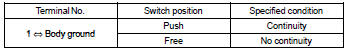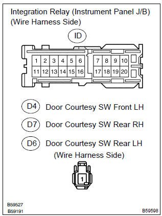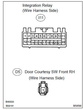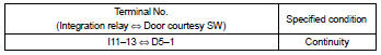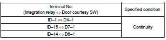 - check the continuity between the terminals of the integration relay and door courtesy switch connectors, as shown in the illustration and table.