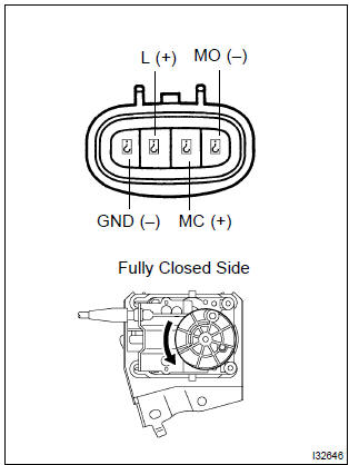 - Connect the positive (+) lead from the battery to the terminal 3 (l) of cruise control actuator assy and the negative (–) lead to terminal 4 (gnd).