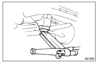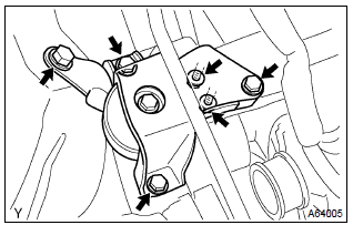 - place a wooden block between the jack and engine, and set the jack. Then, remove the 4 bolts, the 2 nuts and engine mounting insulator rh.