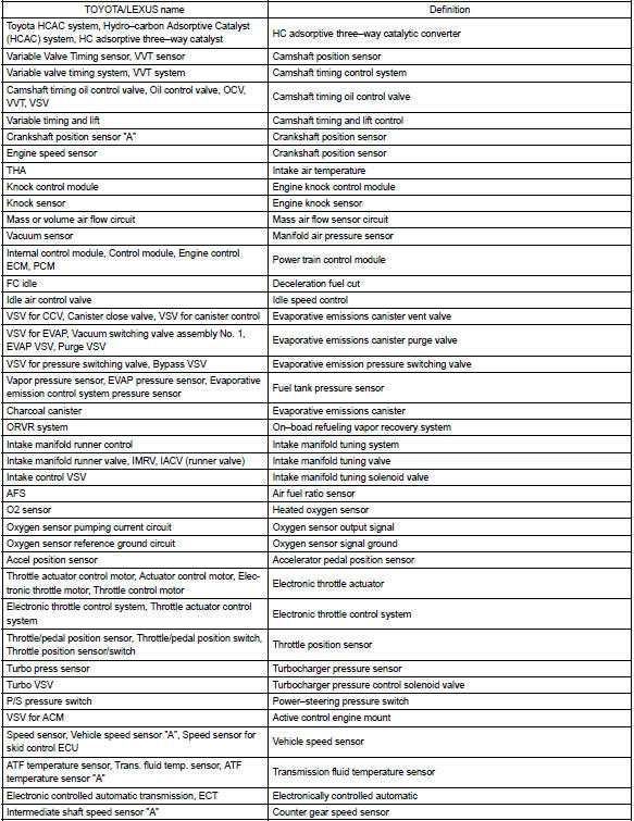 Toyota Corolla (E120) 2002–2008 Repair Manual / Diagnostics / Sfi system / Toyota/lexus part and system name list
